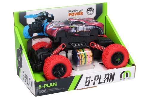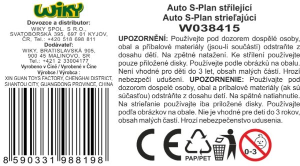 Auto S-Plan. Rozměry 17x10,2x10,2 cm. Na zpětné natažení. Vystřeluje disky. 6 variant.