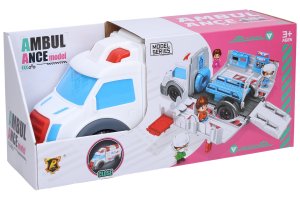 Auto sanitka rozkládací s 2 figurkami. Rozměry 30x9,5x14 cm. Volná kola. Obsahuje, auto, vnitřní vybavení, 2 figurky, polepy. Obrázkový návod na sestavení a používání na zadní straně obalu.