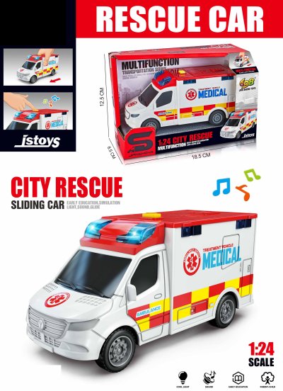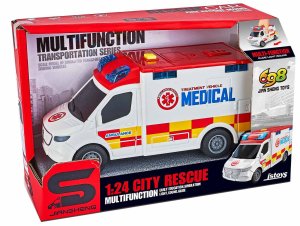 Auto sanitka s efekty. Volná kola. Světelné a zvukové efekty, aktivace tlačítkem na střeše. 3xAG13/LR44 (1.5V) baterie, součástí balení.