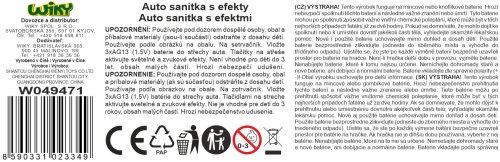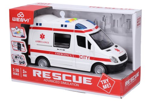 Auto sanitka s efekty. Rozměry 21x10x11 cm. Na setrvačník. Otevírací přední a zadní (posuvné) dveře. Světelné a zvukové efekty tlačítky na střeše. 3xAG13 baterie do střechy součástí.