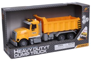 Auto sklápěč s efekty. Rozměry 31x9,5x11 cm. Na setrvačník. Světelné a zvukové efekty tlačítkem na kabině. 3xAG13 baterie do střechy součástí. Sklopná nakládací plocha uvolněním pojistného tlačítka na boční straně pod nakládací plochou. Otevíratelná zadní část nakládací plochy.