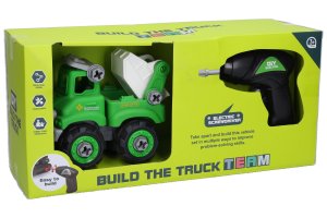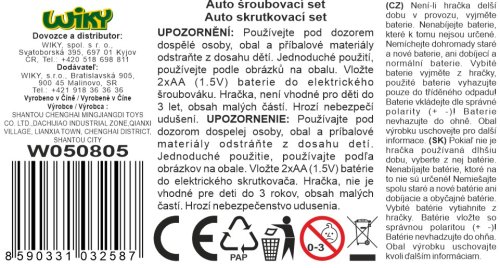 Auto šroubovací set s elektrickým šroubovákem. Obsah balení - popelářské auto (rozměry 17x14x12 cm), manuální šroubovák 11,5 cm, elektrický šroubovák 18 cm. 2xAA baterie, nejsou součástí.