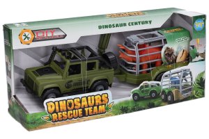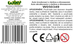 Auto šroubovací s vlečkou a dinosaurem. Rozměry 34x9x10 cm. Velikost auta 17 cm, dinosaura 14,5 cm. Na setrvačník. Součástí šroubovák.