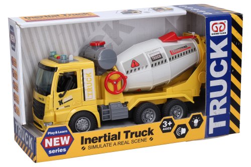 Auto stavební domíchávač na setrvačník s efekty. Velikost 31 cm. Vydává světelné a zvukové efekty. Aktivace tlačítky na střeše (1 tlačítko - zvuk motoru, zvuk míchání, 2 tlačítko - zvuk couvání, zvuk troubení. Baterie 3xAG13 (1.5V), součástí balení.