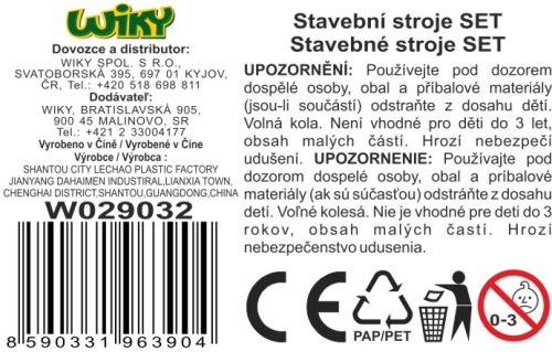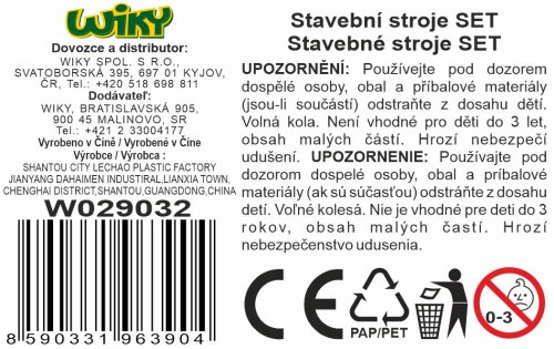 Auto stavební stroj. Velikost 12 cm. Balení obsahuje 3 ks - buldozer, bagr, sklápěč. Sklápěč má sklápěcí korbu. Bagr a buldozer mají polohovatelné lžíce. Volná kola.