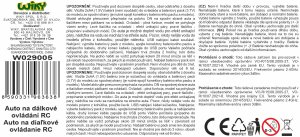Auto závodní RC. Rozměry 28x16x8 cm. Světelné a kouřové efekty. 5 světelných módů. Frekvence 2.4 GHz. Rychlost 12 km/h. Bateriový pack 3.7V 500mah do auta součástí, 2xAA baterie do ovladače nejsou součástí. USB kabel součástí. Nabíjení 2 h. Provozní doba 25 min. Dosah 25 m. Přepínač ON/OFF na spodní straně auta. ON/OFF tlačítko mezi páčkami na ovladači. Levé tlačítko na ovladači - kouřové efekty. Pravé tlačítko na ovladači - přepínání světelných módů. Nádržka na vodu na střeše auta. Nádobka na vodu součástí.