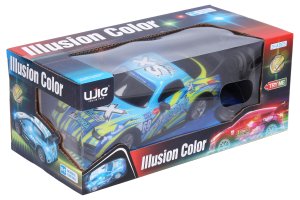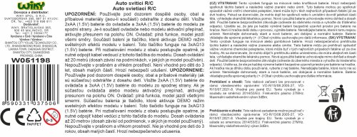 Auto SX svítící RC na dálkové ovládání. Rozměry 20x8x6 cm. Frekvence 27MHz. Světelné efekty povrchu auta. 3xAA baterie do auta, 2xAA do ovladače nejsou součástí. Try Me tlačítko pro světelné efekty v obalu - 3xAG13 baterie (neměnitelné) součástí. Při vybalování nutno odpojit Try Me kabel z auta. Rychlost 10 km/h. Dosah až 20 m. Přepínač ON/OFF na spodní straně auta.