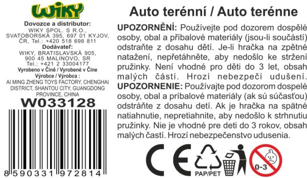 Auto terénní kovové. Rozměry 11x4,5x4,5 cm. Na zpětné natažení. Otevírací přední dveře. 4 varianty - oranžová, černá, modrá, žlutá.