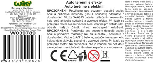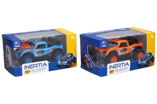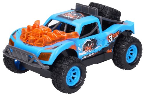 Auto terénní s efekty. Rozměry 15x9,5x8,8 cm. Na setrvačník. Při jízdě se pohupuje motor. Světelné a zvukové efekty zatlačením rezervního kola dolů. 3xAG13 baterie součástí. 2 varianty - modrá, oranžová.