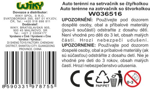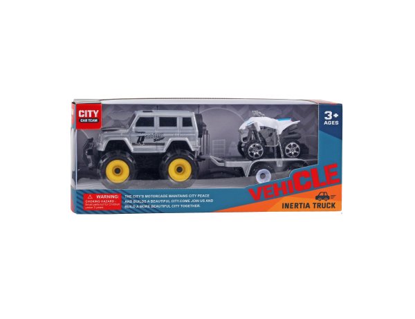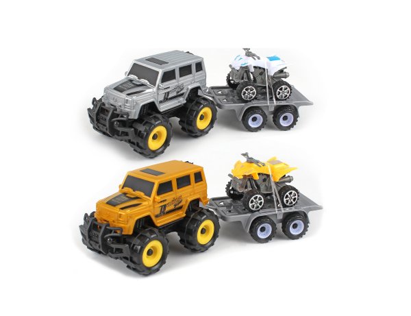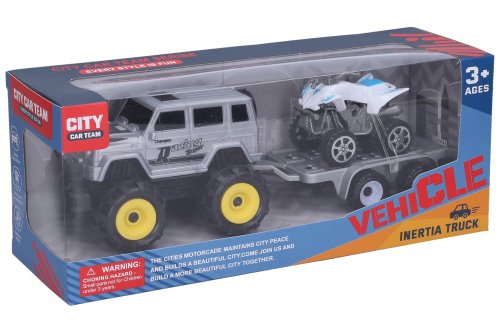 Auto terénní se čtyřkolkou 25 cm. Auto na setrvačník, přívěs a čtyřkolka volná kola. 2 varianty - šedá, žlutá.