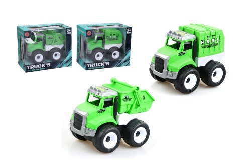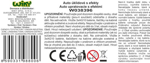 Auto úklidové. Rozměry 16,5x11,5x12,5 cm. Na setrvačník. Světelné a zvukové efekty tlačítky na kabině. 3xAG10 baterie součástí. 3 varianty.