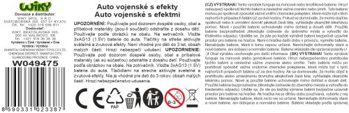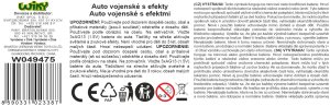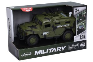 Auto vojenské s efekty. Rozměry 25,5x11x13 cm. Na setrvačník. Otevírací přední dveře. Světelné a zvukové efekty tlačítky v zadní části střechy. 3xAG13 baterie na střeše pod tlačítky, součástí balení.
