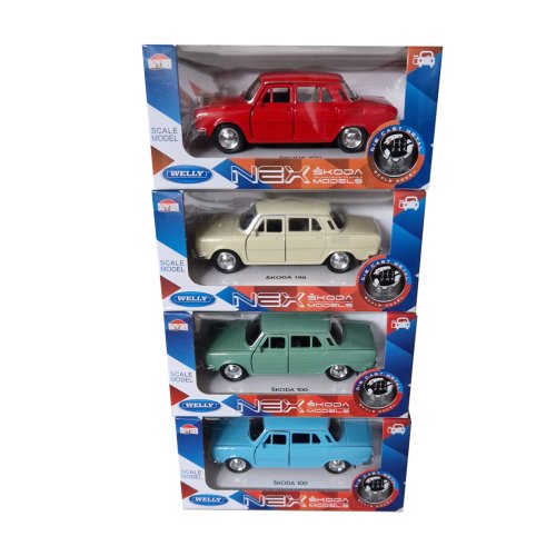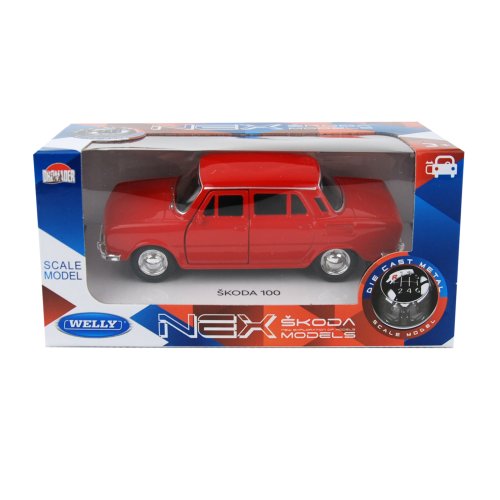Auto Škoda 100 v měřítku 1:34. Vyrobené z kovových a plastových dílů, otevírací dveře. Baleno v papírové krabičce s fóliovým průhledem, obal Škoda models. Přišroubováno na papírovém podstavci s popisem typu. Rozměr auta: 11 cm Rozměr balení 15 x 7 x 7 cm Vhodné pro děti od 3 let