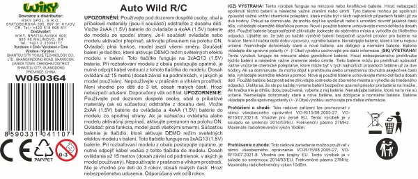 Auto Wild svítící RC na dálkové ovládání. Rozměry 26x11x6,5 cm. TRY ME tlačítko v obalu se světelnými efekty auta. Frekvence 27MHz. Světelné efekty povrchu auta. 4xAA baterie do auta, 2xAA do ovladače nejsou součástí. Přepínač ON/OFF na spodní straně auta. 2xAG13 neměnitelné v TRY ME tlačítku obalu, nutné odpojit kabel z auta při vybalování.