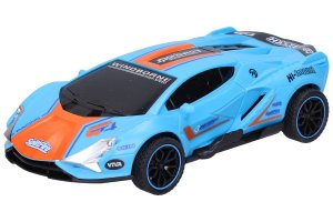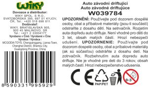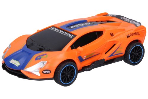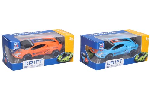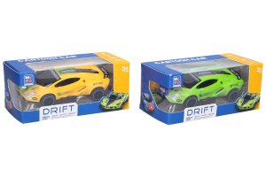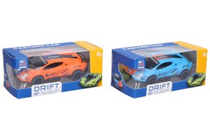 Auto závodní driftující. Rozměry 15,5x8x4 cm. Rozjetím auta dopředu samo driftuje (smykuje) - uprostřed podvozku je kolmé kolečko. Na setrvačník. 4 varianty - modré, zelené, oranžové, žluté.