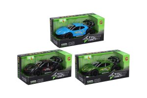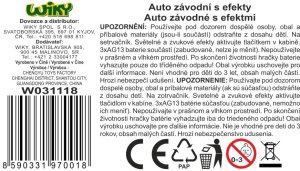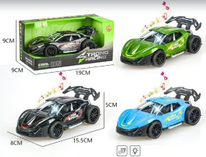 Auto závodní s efekty. Rozměry 16x8x5 cm. Na setrvačník. Světelné a zvukové efekty tlačítkem v kabině. 3xAG13 baterie součástí, nelze měnit. 3 varianty - zelená, černá, modrá.
