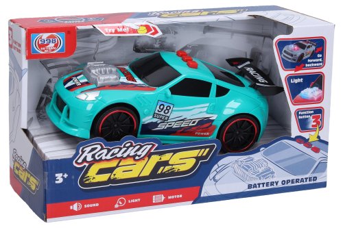 Auto závodní s efekty. Velikost 21 cm. Vydává světelné a zvukové efekty. Aktivace tlačítky na střeše. Levé tlačítko - zvuk motoru, pohyb dopředu a po krátké pauze pohyb dozadu. Prostřední tlačítko - zvuk troubení. Pravé tlačítko - hudba. Baterie 3xAA (1,5V), nejsou součástí.