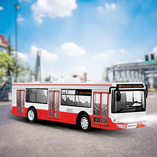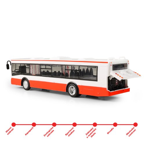 Originální autobus, který oznamuje stanice v českém jazyce, je rozhodně ten pravý dárek pro vaši jízdu! Vaše děti si ho zamilují! Dveře, lze manuálně otevřít a zavírají se pomocí tlačítka umístěného na střeše vozu. Při každém otevření se ozve hlášení, při zavření navíc blikají přední světla autobusu. Autobus v měřítku 1:43 je vyroben z plastu, jeho délka je 28 cm a vyžaduje použití 3 ks baterií LR44/AG13, které jsou jeho součástí. Autobus jezdí na zpětný chod. Tahle unikátní hračka nadchne všechny kluky i holky! Rozměry balení 33 x 10,5 x 10 cm. Vhodné pro děti od 3 let.