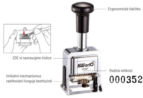 Šestimístné číslovací razítko s automatickým posunem číslic dle nastavení uživatelem.Vyrobeno z kvalitního kovu pro dlouhou životnost.