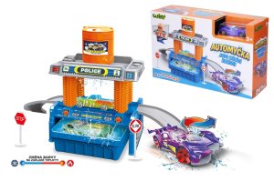 Auto měnící barvu podle teploty set s myčkou 35 cm. Rozměry myčky 35x16x24 cm. Auto 8 cm, volná kola. Auto mění barvu v závislosti na teplotě. Umyjte studenou vodou, nebo teplou vodou (více než 37°C). Nasajte do nádržky vodu (nádržka je měkká, zmáčknutím a uvolněním nasajete vodu). Nádržku umístěte na myčku a zmáčkněte. Obrázkový návod na sestavení na obalu.