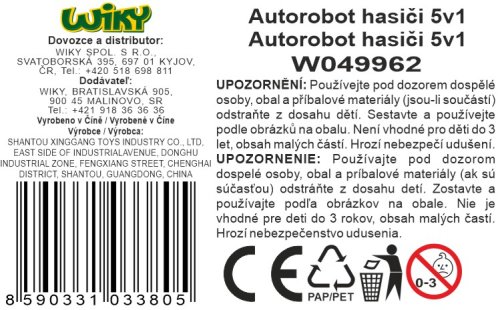 Autorobot set 5v1 hasiči. Výška 24 cm. Velký autorobot, který se skládá z 5 menších robotů. Návod na složení na zadní části obalu.