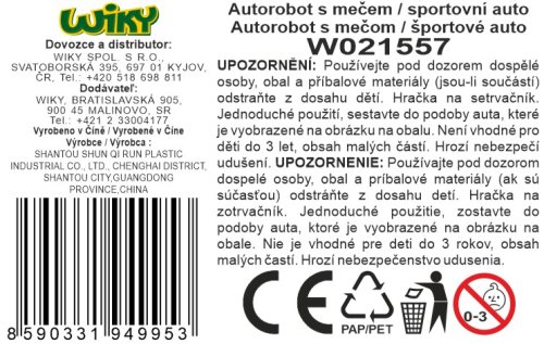 Autorobot. Transformace na sportovní auto. Velikost 15 x 11cm. Balení obsahuje meč a štít. Na setrvačník. 2 varianty - modrá, fialová.