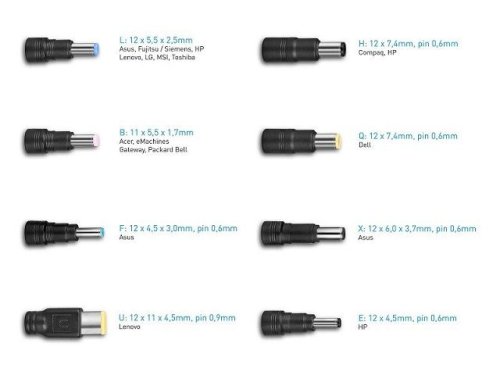Univerzální nabíjecí adaptér může nahradit zejména adaptéry s výkonem 20W, 30W, 33W, 36W, 40W, 45W, 50W, 60W, 65W, 70W, 72W, 75W, 80W, 85W, 87W, 90W, 95W, 100W, 105W, 110W, 120W, 130W, 135W, 150W, 160W, 170W, 180W, 200W, 210W, 230W, 240W, 250W nebo jiné adaptéry v tomto výkonovém rozmezí.