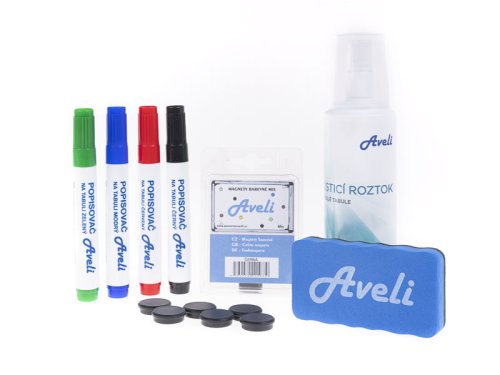 "Základní sada pomůcek k popisovacím tabulím. Sada obsahuje: 4 barevné popisovače na bílé tabule, čistící 250 ml sprej, 6 kulatých magnetů o průměru 24mm , 1 magnetická stěrka.