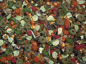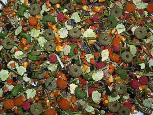 složení: zelenina (mrkev, červená řepa, pastyňák, petržel), vojtěška, hrachové vločky, pšenice, kukuřice, svatojánský chléb, pšeničné vločky, oves, měsíček.
