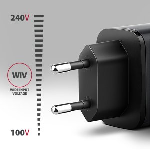 Nabíječka podporuje funkce WIV, AIC, CC: • Wide Input Voltage - funkce širokého rozsahu vstupního napětí, chrání adaptér proti podpětí a přepětí na vstupu a umožní použití více "národních napájecích standardů". • Automatic Intelligent Communication - funkce automatického rozpoznání připojeného zařízení pro zvolení optimálních parametrů nabíjení. • Constant output Current - funkce udržování konstantního proudu zabraňuje kolísání výstupního výkonu, tato funkce zajišťuje stabilní průběh nabíjení.