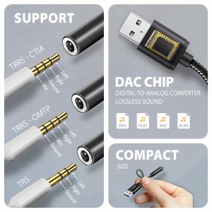 Další vlastnosti: • Vestavěný sluchátkový zesilovač 27.5 mW @ 32 ohm. • Rozsah impedance připojených sluchátek 16 - 300 ohm. • Frekvenční rozsah 20 Hz - 20 kHz. • Podpora bezztrátových formátů: DSD64, DSD128, FLAC, WMA, WAV, APE, AAC, ALAC • Snadná instalace díky plné podpoře Plug and Play. • Možnost připojení zařízení za chodu díky podpoře Hot Plug. • 3.5 mm jack, TRS, TRRS (CTIA a OMTP autodetekce) kompatibilní. • Vyhovuje USB Audio Device Class specifikaci v1.0 / 2.0. • Napájení adaptéru po USB sběrnici (bus power) - není potřeba žádné přídavné napájení. • Miniaturní rozměry 25 x 7 mm, délka kabelu 10 cm. • Hmotnost pouze 8 g.