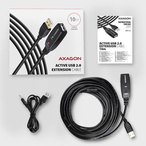 Balení v kartonové krabičce obsahuje: • USB 2.0 A-M > A-F aktivní kabel délky 10 m, • USB-A / 3.5 mm napájecí kabel, • vícejazyčný návod CZ/DE/DK/ENG/ESP/FIN/FR/GR/HR/HU/IT/NL/PL/PT/RO/RU/SK/SWE/BG/CN/TR/ARA.