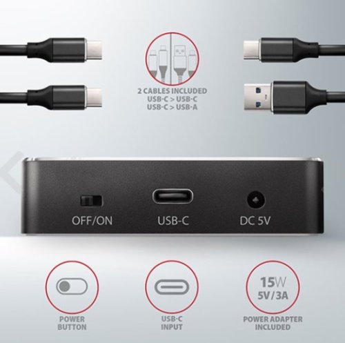SuperSpeed USB-C 10 Gbps dokovací stanice AXAGON ADSA-M2C DUAL NVMe CLONE MASTER DOCK připojí k počítači snadno a rychle až dva NVMe (PCI-Express) M.2 SSD disky. Pohodlné připojení umožňuje oboustranný USB-C konektor. V balení naleznete rovnou dva kabely pro připojení dokovací stanice - klasický kabel USB-C -- USB-A a také USB-C -- USB-C kabel.