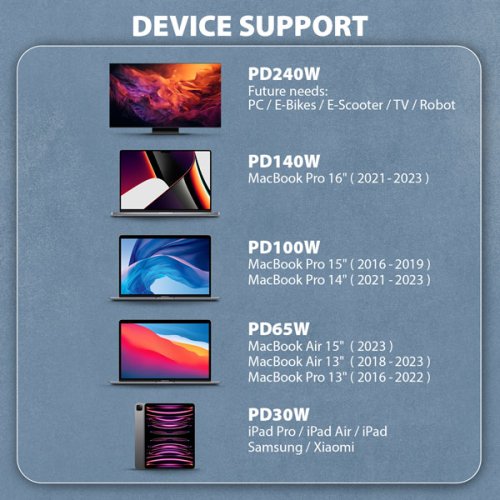 Další vlastnosti: • DATA SYNC & FAST CHARGING - současný přenos dat a nabíjení připojeného zařízení. • USB 480Mbps (USB 2.0), kompatibilní s USB 1.1. • Podpora přenosových rychlostí 480 / 12 / 1.5 Mb/s. • Podporované technologie nabíjení: Power Delivery 2.0/3.0/3.1 - 240W (48V/5A), Qualcomm Quick Charge 2.0 / 3.0 / 4+, PPS, Samsung Adaptive Fast Charging a Super Fast Charging, Huawei Fast Charge Protocol, Apple Fast Charging, SMART Charging a další. • Podpora specifikace Extended Power Range (EPR) do 240W a specifikace Standard Power Range (SPR) do 100W. • Podpora rychlého nabíjení proudem až 5A. • Integrovaný E-MARK čip. • Kabel obsahuje napájecí vodiče 22AWG, datové vodiče 30AWG. • Vodiče z pocínované bezkyslíkaté mědi pro omezení oxidace, zvýšení vodivosti a čistý signál bez zkreslení. • Stínění pokovenou fólií a opletením z pocínované mědi minimalizuje rušení a zabraňuje ztrátě signálu. • Poniklované konektory a pozlacené kontakty zamezují oxidaci a zajišťují spolehlivé spojení. • Vhodný pro počítače, notebooky, mobilní telefony, tablety, powerbanky, elektrické nářadí a další zařízení s USB-C konektorem.