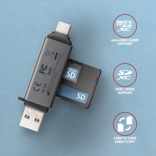 Mobilní Mini čtečka paměťových karet AXAGON CRE-DAC s rozhraním USB 5 Gbps podporuje všechny současné verze SD a microSD karet včetně SDXC a microSDXC s kapacitou až 2TB.