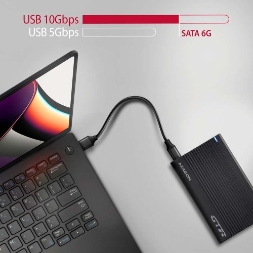 Díky rychlému USB 3.2 Gen 2 rozhraní s přenosovou rychlostí až 10 Gb/s není omezena rychlost 2.5" SSD disků. Oproti běžným boxům s USB 3.2 Gen 1 (USB 3.0) rozhraním je přenosová rychlost tohoto boxu s SSD diskem o cca 20 % vyšší. Podpora funkce UASP pro rychlejší přenos dat a funkce TRIM pro omezení pozvolné degradace výkonu SSD v čase. Čtení S.M.A.R.T. informací monitorujících kondici externího disku. Podpora uspávání připojeného disku i boxu.
