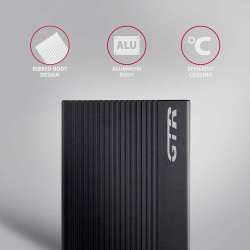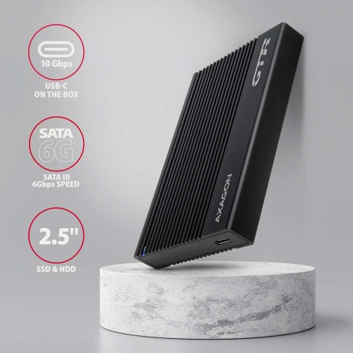 Žebrovaný hliníkový externí AXAGON EE25-GTR RIBBED box s USB-C 10Gbps rozhraním určený pro 2.5" SATA pevné disky nebo SSD. Spolehlivé připojení k počítači umožňuje oboustranný USB-C konektor na boxu spolu s dodávaným kabelem USB-C --- USB-A a redukcí USB-A -- USB-C.