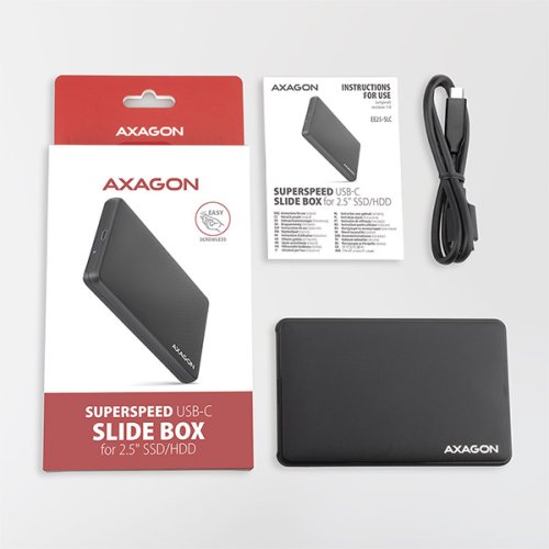 Lehký bezšroubkový externí AXAGON EE25-SLC SLIDE BOX s USB 3.2 Gen 1 (USB 3.0) a SATA 6G rozhraním je určen pro všechny 2.5" SATA pevné disky nebo SSD. Spolehlivé a pohodlné připojení umožňuje oboustranný USB-C konektor. SATA 6G rozhraní s podporou UASP dovolí užívat si rychlost moderních SSD disků. Podpora funkce TRIM pro omezení pozvolné degradace výkonu SSD v čase. Čtení S.M.A.R.T. informací monitorujících kondici externího disku. Podpora uspávání připojeného disku i boxu. Plastové tělo boxu umožňuje snadnou výměnu disku bez potřeby šroubování. Decentně vroubkovaný povrch krytu je odolný proti poškrábání a brání nežádoucím otiskům prstů. Pěnové výplně uvnitř boxu fixují a chrání vložený disk.