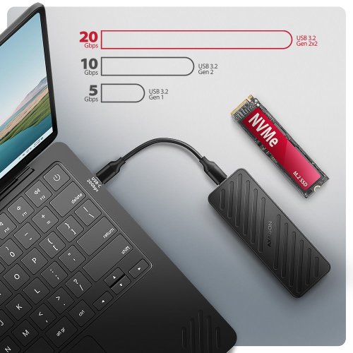 Díky USB 20Gbps rozhraní je přenosová rychlost až 20 Gb/s. Pro plné využití rychlosti boxu musí být řadič připojeného zařízení kompatibilní s USB 3.2 Gen 2x2. Tyto řadiče se obvykle používají v herních noteboocích a moderních stolních počítačích. Externí M.2 box podporuje i další moderní funkce např. UASP, TRIM a umožňuje čtení S.M.A.R.T. informací monitorujících stav disku. Podpora úsporného režimu při nečinnosti.