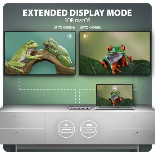 Rozlišení a vlastnosti videa: • Maximální podporované rozlišení při zapojení každého z portů samostatně 4K / 4096 x 2160 při 60 Hz. • 2 současně připojené monitory - až 4K/60Hz na obou monitorech. • Pro správnou funkci video výstupu je nutné hub zapojit do USB-C portu s podporou DisplayPort Alternate Mode (DP Alt Mode) verze 1.4 a výš, nebo do USB-C portu s podporou Thunderbolt 3/4. Dále je nutný vhodný OS. Bez této podpory nebude funkce video výstupu dostupná. • Podpora HDR (High dynamic range, 10 bit support) - realistická reprodukce světlých a tmavých detailů. • Podpora HPD (Hot-Plug-Detect). • Podpora TMDS (Transition Minimized Differential Signaling). • Plná podpora HDCP 1.4 a 2.3 (High-bandwidth Digital Content Protection). • Podpora až 8kanálového LPCM zvuku, komprimovaného audia (AC-3, DTS) a HBR audio formátů. • Podpora vzorkovací frekvence až 192 kHz a až 24bitového zvuku – závisí na zdrojovém a koncovém zařízení, tj. notebooku/telefonu a TV/monitoru/AV receiveru.