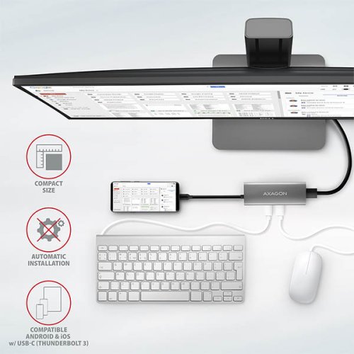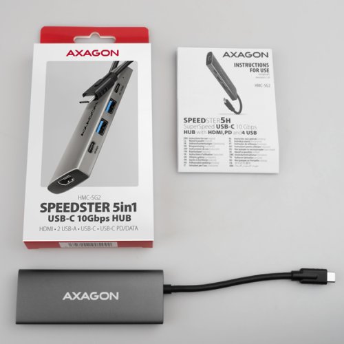 Multiportový USB-C 10Gbps AXAGON HMC-5G2 SPEEDSTER 5in1 hub rozšíří Váš notebook, počítač nebo telefon o pětici portů. Přes oboustranný USB-C konektor snadno a rychle připojíte k počítači monitor a tři USB zařízení současně. Zároveň získáte možnost napájení notebooku pomocí technologie Power Delivery. Replikátor portů vám tak poskytne jednoduchou a skladnou dokovací stanici 5v1 nejen k Windows notebookům ale i Apple notebookům jako je například MacBook Air nebo MacBook Pro. USB rozbočovač nabízí celkem čtyři USB výstupy o rychlosti 10Gbps - dva se standardními USB-A konektory a dva s USB-C. Díky pokročilému standardu USB 3.2 Gen 2 můžete ke všem výstupům připojit vysokorychlostní zařízení jako NVMe M.2 externí disky až 2x vyšší rychlostí 10 Gb/s oproti standardním hubům Gen 1 s rychlostí pouze 5 Gb/s. Multiportový hub zvládne trvalé připojení několika externích disků současně a také dovolí nabíjení notebooků, telefonů a tabletů proudem až 3A. Z hubu tak snadno nabijete např. Android smartphone, Apple iPhone, Apple iPad apod. Jeden z USB-C portů je kombinovaný a může být použit buď pro přenos dat, nebo pro nabíjení telefonů a notebooků pomocí technologie Power Delivery 3.0 výkonem až 100W. Do hubu zapojíte vhodnou USB-C Power Delivery nabíječku a hub připojíte k notebooku s podporou Power Delivery. Tím také uvolníte jeden USB-C port. HDMI výstup poskytuje kvalitní obraz až do rozlišení 4K/60Hz Ultra HD a podporuje přenos vícekanálového zvuku. Podporovány jsou také vysoké frekvence v oblíbených hráčských rozlišeních 2K/120Hz nebo FullHD/120Hz. Díky podpoře HDR (vysoký dynamický rozsah) si můžete bez omezení vychutnat výrazně rozšířený rozsah barev a kontrastů. Pro správné fungování video výstupu je nutné, aby notebook měl USB-C port s podporou DisplayPort Alternate Mode (DP Alt Mode) nebo port Thunderbolt 3, 4 a výše. Kompaktní a štíhlé hliníkové tělo nejen skvěle vypadá, ale zajistí i mechanickou odolnost a pasivní chlazení. Potěší také jemně strukturovaný povrch, na kterém nezůstávají otisky prstů. USB-C hub je ideálním doplňkem pro notebooky bez USB-A konektorů a video výstupu. Lze tak využít Vaše stávající USB periferie bez nutnosti pořizování nových. Díky funkcím Plug and Play a Hot Plug je samotné zapojení hubu velmi jednoduché bez složité instalace, a také lze jednoduše připojovat a odpojovat periferie za běhu počítače. Rozbočovač se nezalekne ani připojení k telefonům s USB-C konektorem. K telefonu tak připojíte například flash disk, klávesnici, myš, monitor, TV nebo projektor.