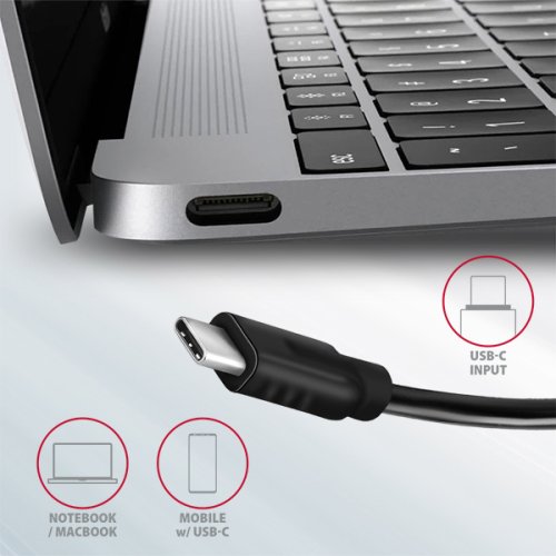 Vstup (připojení k notebooku): • USB 10Gbps (USB 3.2 Gen 2), konektor USB-C male. • Kompatibilní s USB 3.2 Gen 1, USB4 a Thunderbolt 3/4.