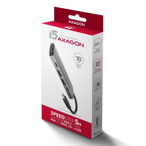 Multiportový USB-C 10Gbps AXAGON HMC-5G21 SPEEDSTER 5in1 hub rozšíří váš notebook, počítač nebo telefon o pětici portů. Připojení k zařízení probíhá prostřednictvím 13 cm USB-C kabelu. Okamžitě tak máte k dispozici připojení pro 4K monitor a další USB periferie. Zároveň získáte možnost napájení notebooku pomocí technologie Power Delivery. Kompatibilita s Thunderbolt 3/4/5 vám také poskytne jednoduchou a skladnou dokovací stanici k notebooku jako je například Apple MacBook Air nebo Pro. Dva USB-A 10Gbps výstupy umožňují připojení externích disků, flash disku, myši, tiskárny a dalšího USB příslušenství. USB porty také nabíjí mobilní telefony a tablety proudem až 1.5A. Hub je také vybaven kombinovaným USB-C portem, který může být použit pro přenos dat (USB 10Gbps), nebo pro nabíjení notebooku pomocí Power Delivery nabíječky. S využitím vhodné PD nabíječky tak napájíte nejen notebook, ale i samotný hub, s výkonem až 60W díky technologii Power Delivery 3.0. HDMI výstup umožňuje připojení externího monitoru, TV nebo projektoru s rozlišením až 4K/30Hz Ultra HD, 2K/60Hz Quad HD nebo 1080p/120Hz Full HD a přenos vícekanálového zvuku. Pro správné fungování video výstupu je nutné, aby notebook měl USB-C port s podporou DisplayPort Alternate Mode (DP Alt Mode) nebo port Thunderbolt 3 a výše. Kompaktní a štíhlé hliníkové tělo nejen skvěle vypadá, ale zajistí i mechanickou odolnost a pasivní chlazení. Potěší také jemně strukturovaný povrch, na kterém nezůstávají otisky prstů. USB-C hub je ideálním doplňkem pro notebooky bez USB-A konektorů a video výstupu. Lze tak využít Vaše stávající USB periferie bez nutnosti pořizování nových. Díky funkcím Plug and Play a Hot Plug je samotné zapojení hubu velmi jednoduché bez složité instalace, a také lze jednoduše připojovat a odpojovat periferie za běhu počítače. Rozbočovač se nezalekne ani připojení k telefonům s USB-C konektorem. K telefonu tak připojíte například flash disk, klávesnici, myš, monitor, TV nebo projektor.