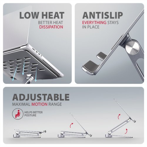 Vlastnosti stojanu: • Lehká a pevná kovová konstrukce. • Protiskluzová úprava, která zároveň chrání zařízení od poškrábání. • Vhodný pro 10" - 16" notebooky, nebo jiná zařízení. • Nastavitelná výška až 205 mm. • Mnoho nastavitelných poloh • Nastavení sklonu podstavce (180° - 90°) • Nastavení sklonu ramene (180° - 90°) • Skladný a lehce složitelný. • Lepší odvod tepla z notebooku.