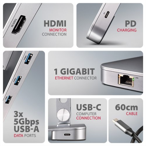 AXAGON HMC-STND 7in1 Hub & Stand je jedinečný multifunkční hub integrovaný do stojanu pro notebook nebo tablet. Tento hub rozšíří Váš notebook nebo tablet o dalších šest portů. Váš notebook připojíte k hubu přes USB-C <-> USB-C kabel dlouhý 60 cm. Okamžitě tak máte k dispozici připojení pro monitor, tři USB zařízení, konektor RJ-45 pro Gigabitovou ethernet síť a napájení notebooku pomocí technologie Power Delivery. Stojan s dvěma klouby zlepšuje ergonomii a pohodlí při práci a je vhodný pro zařízení od 10" do 16". Je ideální jako dokovací stanice 7v1 pro Windows notebooky i Apple MacBook Air nebo MacBook Pro. Tři USB-A 5Gbps výstupy umožňují připojení externích disků (až 2 současně), flash disku, myši, tiskárny a dalšího USB příslušenství. USB porty také nabíjí mobilní telefony a tablety výkonem až 7.5W. Gigabitová síťová karta rozšíří počítač o rychlé a stabilní síťové připojení, doplní chybějící síťový RJ-45 Ethernet konektor, nebo přidá další síťovou kartu. HDMI výstup umožňuje připojení externího monitoru, TV nebo projektoru s rozlišením až 4K/60Hz Ultra HD, 2K/120Hz Quad HD nebo 1080p/200Hz Full HD a přenos vícekanálového zvuku. Díky podpoře HDR si můžete vychutnat výrazně rozšířený rozsah barev a kontrastů bez omezení. PD USB-C vstup je určen pro vhodnou Power Delivery nabíječku. Díky tomu je vaše mobilní zařízení i hub napájen přímo z PD nabíječky s využitím technologie Power Delivery 3.0 s výkonem až do 100W. Druhý USB-C konektor slouží k propojení s notebookem pomocí přiloženého 60 cm dlouhého kabelu s oboustranným USB-C konektorem na obou koncích. Díky funkcím Plug and Play a Hot Plug je samotné zapojení hubu velmi jednoduché bez složité instalace, a také lze jednoduše připojovat a odpojovat periferie za běhu počítače. Velkou výhodou stojanu je chytré řešení s dvojitým kloubem, které umožňuje nastavit úhel náklonu i výšku obrazovky notebooku tak, aby byla v jedné rovině s externím monitorem. Tím získáte další pracovní plochu ve správné úrovni očí, což výrazně zlepšuje ergonomii, zvyšuje pohodlí při práci a podporuje vaši produktivitu. Elegantní design tohoto stojanu nejen stylově doplní váš pracovní stůl, ale zároveň nabízí praktické funkce. Podstavec i kryt hubu jsou vyrobeny z robustních hliníkových odlitků, které zajišťují pasivní chlazení a garantují dlouhou životnost a spolehlivost stojanu i hubu. Výřezy v podstavci navíc optimalizují odvod tepla z notebooku, což přispívá k vyššímu výkonu a delší životnosti vašeho zařízení. Díky protiskluzové úpravě zůstane vaše zařízení bezpečně na svém místě bez rizika nechtěných pohybů, a to bez jakéhokoliv poškození povrchu notebooku nebo podložky.