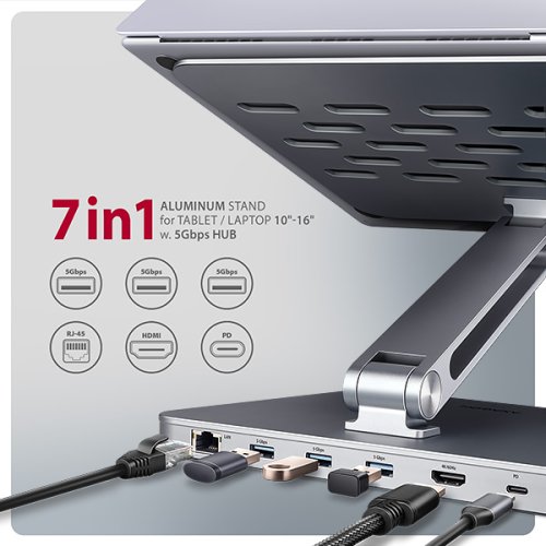 AXAGON HMC-STND 7in1 Hub & Stand je jedinečný multifunkční hub integrovaný do stojanu pro notebook nebo tablet.
