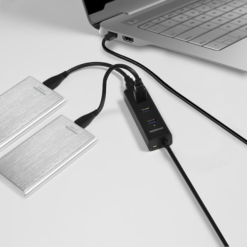 Zvládne trvalé připojení až dvou externích disků i bez vlastního napájení hubu. S vlastním napájením připojí až tři 2,5" magnetické externí disky.