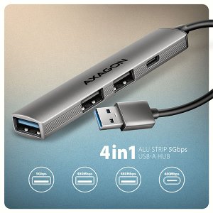 Tenký hliníkový USB-A 5Gbps AXAGON HUE-STA ALU STRIP hub snadno a rychle připojí k notebooku nebo počítači až čtyři USB zařízení současně. Váš notebook připojíte k hubu přes 12 cm dlouhý USB-A kabel. USB rozbočovač nabízí čtyři USB výstupy - jeden USB-A 5Gbps, ideální pro rychlé připojení externích disků či flash pamětí. Dva standardní USB-A 480 Mbps výstupy jsou dostačující pro spolehlivé připojení myši, klávesnice nebo tiskárny. Čtvrtý USB-C 480Mbps datový konektor umožňuje připojení většiny mobilních telefonů a dalších zařízení s běžnou přenosovou rychlostí. Štíhlé hliníkové tělo nejen skvěle vypadá, ale zároveň poskytuje mechanickou odolnost a pasivní chlazení. USB-A hub je ideálním doplňkem pro notebooky s omezeným počtem USB-A konektorů, díky čemuž můžete nadále využívat své stávající periferie bez nutnosti pořizovat nové. Funkce Plug & Play a Hot Plug zajišťují snadné zapojení bez složité instalace a umožňují pohodlné připojování i odpojování zařízení za chodu počítače. Hub si poradí i s trvalým připojením několika externích disků.