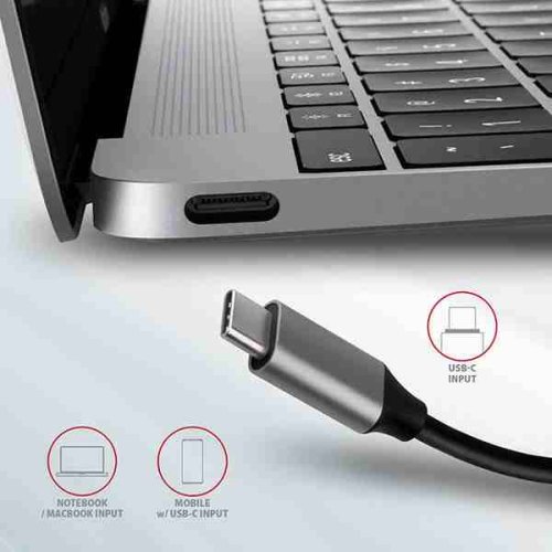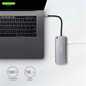 USB-C konektor je vyhrazen pouze pro nabíjení telefonů nebo notebooků pomocí technologie Power Delivery 3.0 výkonem až 100W. Do hubu zapojíte USB-C Power Delivery nabíječku a hub připojíte k notebooku. Tím také uvolníte jeden USB-C port. Podmínkou je notebook s podporou nabíjení z USB-C portu pomocí Power Delivery a vhodná PD nabíječka.