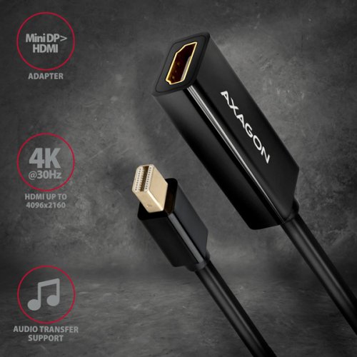 Mini DisplayPort -- HDMI aktivní adaptér AXAGON RVDM-HI14N pro připojení HDMI monitoru/TV/projektoru k počítači s výstupem Mini DisplayPort.